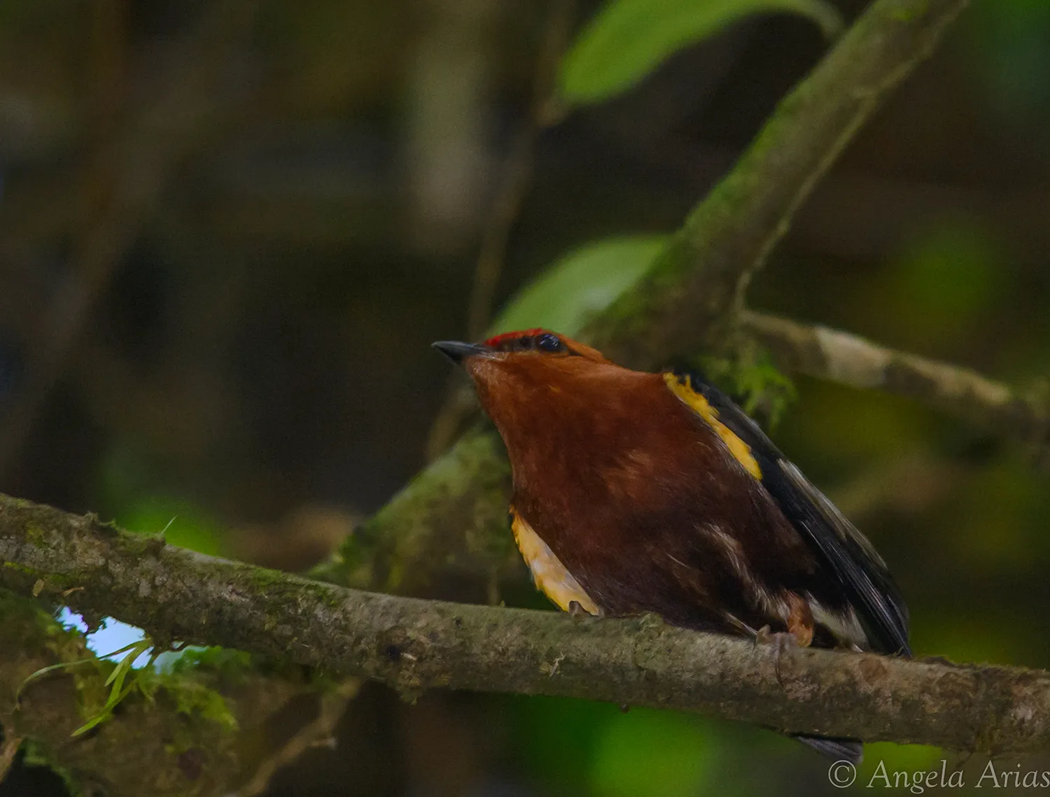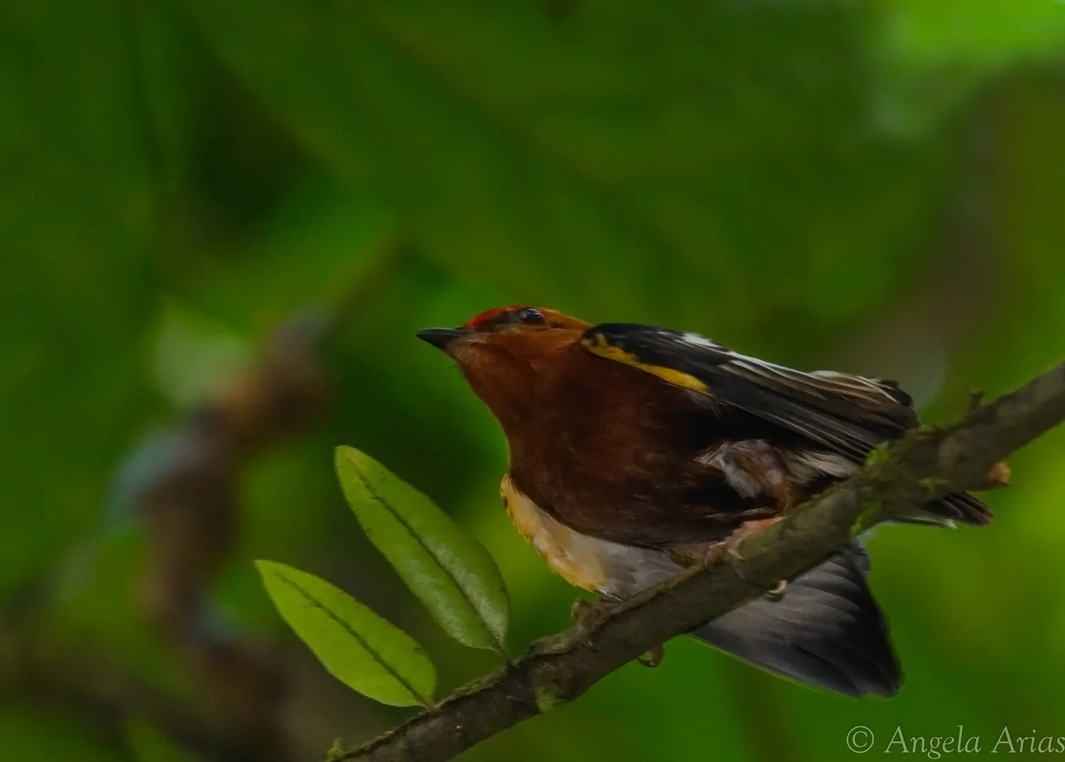 En condiciones muy difíciles, por la espesura del bosque, pude fotografiar a este pequeño manakin, se le conoce como saltarin alitorcido por la forma en que coloca las alas en el cortejo. Estoy sacando fotos del baúl a ver si me pongo al día con el archivo, saludos